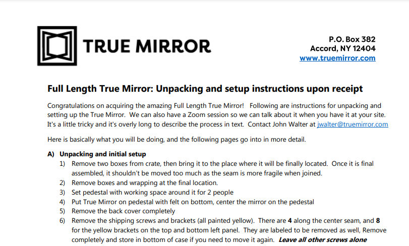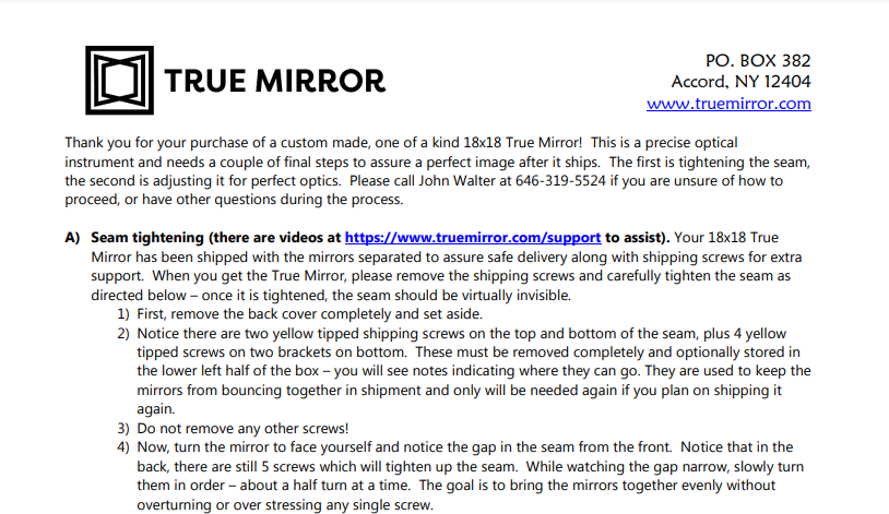 Here are some videos and manuals for working with the True Mirror, primarily for the larger sizes. Info about the 12×12 will be coming…please email info@truemirror.com if you have questions for that size.